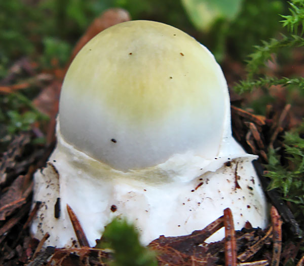 Zaļā mušmire Amanita phalloides tiktikko izlīdusi no zemes, vēl cepurīte kopā ar maksti