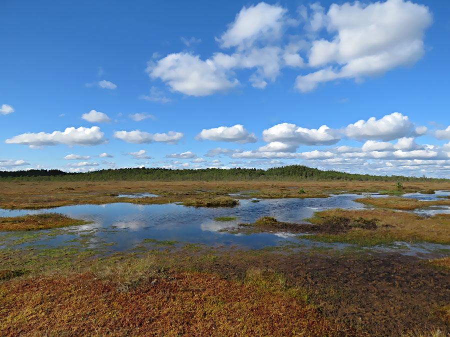 Ir dažādi purvu tipi. Teiču purvā lielāko daļu aizņem augstais jeb sūnu purvs, kurā dominē sūnas, no tām - sfagni. Bet sastopami arī zāļu un pārejas purvi, kuros mazāk sfagnu, toties vairāk dažādu lakstaugu. Attēlā redzami tipiski zāļu un pārejas purvu augi - purva jāņeglīte Pedicularis palustris ziedos un purva vārnkāja Comarum palustre augļu stadijā pārejas purvā Islienas ezera krastā. |